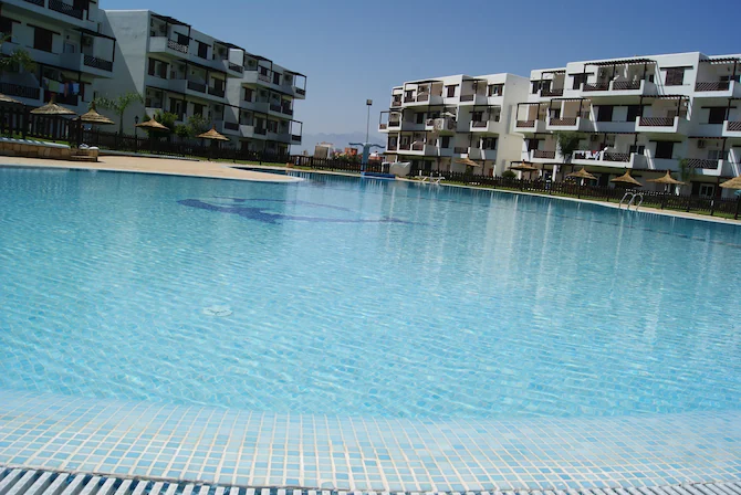 Équipé d'une grande piscine pour adultes et d'une piscine pour enfants, aires de jeux pour enfants, jardins, aires de jeux, en plus de places de parking couvertes , Équipe de sécurité 24/24